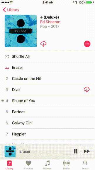 The Music app UI is very clean and simple. A lot of options are hidden away in menus or behind swipes. A simple way to reveal contextual options for a song or an album, or basically any list item is to 3D Touch on it.