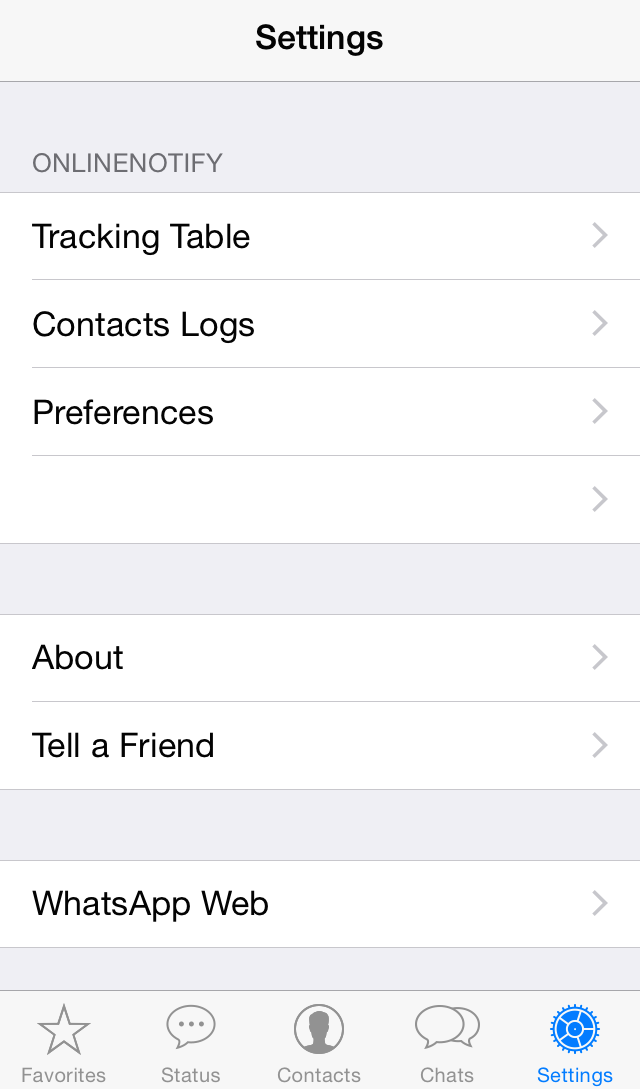 To get started receiving notifications whenever a contact gets online or offline, launch WhatsApp and open the Settings tab. You will notice a new section labelled ‘OnlineNotify’ containing Tracking Table, Contacts Logs and Preferences options. Open Tracking Table and tap on the add button to choose the contacts whom you want to keep track of. The Contacts Logs option is where you can view all the notification logs of each tracked contact.