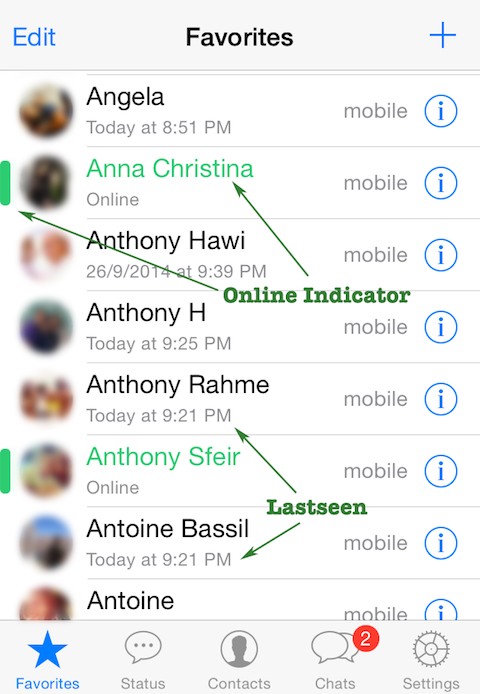 - Adds an online indicator next to the online contacts in WhatsApp Favorites tab as well as in Group Info
