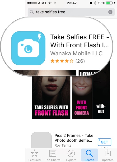 Go to the App Store and search for “front flash: selfie camera” and select the app with the baby blue icon created by Wanaka Mobile LLC. The app is called, Take Selfies Free – With Front Flash In Low-Light. I’ll be using this app with my iPhone 5s.