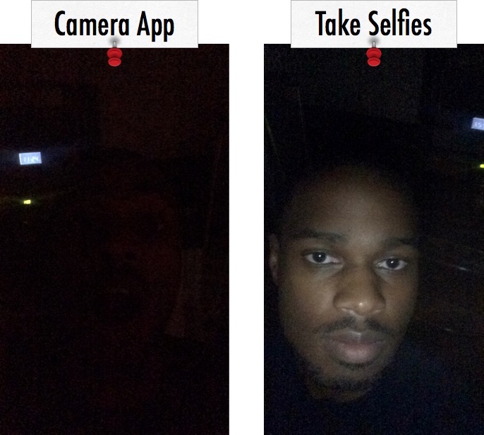 Now, let’s take a look at the comparison below. I shot both images in our kitchen with very little lighting in the room. The image on the left is from the stock Camera. The image on the right is from the Take Selfies Free app. Without question, Take Selfies Free added enough light to at least make my face visible. Without the front screen flash, the default Camera cannot overcome the darkness at all.