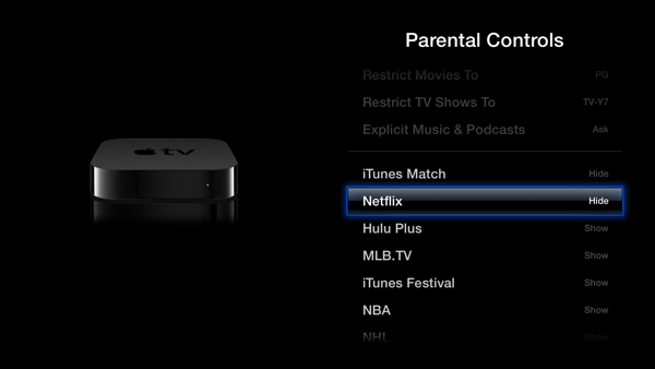 Note: You don’t need to turn on Parental Controls to hide the icons, however if you want to prevent someone from changing these settings then you need to turn on parental controls. If you’ve enabled Parental Controls then you will get a third option “Ask,” which is not relevant to hiding an app on Apple TV’s home screen but as you might have guessed is useful for parental control as it will prompt the user for a passcode to access the app.