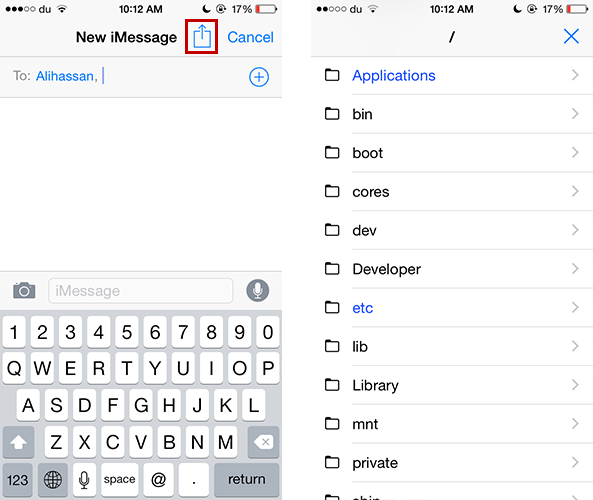 With the tweak installed, you can easily send any type of file to your contacts from iMessage using iOS’s filesystem. It adds a new icon to the Navigation Bar in the conversation interface. Tapping on it opens your device’s filesystem where you can navigate through folders and find the file which you’d like to send.
