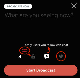 Tapping on the Camera icon allow you to begin streaming. First, you need to name your stream so that viewers will be able to find and identify it. After that, you can choose to share your stream with everyone or a select few with a private broadcast. You can also announce your live-stream via Twitter by tapping on the Twitter icon.