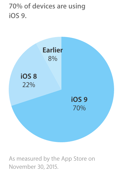 iOS 9 is now running on 70 percent of compatible devices just over two months after making its public debut. The update has increased its share by 4 percent over the last month alone, while iOS 8 and earlier versions of Apple’s platform have seen their share fall.