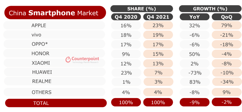 Apple dethroned Vivo to become China’s top-selling smartphone brand. The research firm notes that the iPhone controlled 23 percent of the country’s market in Q4 2021. The company has never enjoyed such a high market share in China before. The success can be attributed to the iPhone 13 models that caused stampedes when it launched in China. The model offers 5G features and an improved camera at an attractive starting price. They were also the country’s highest-selling smartphone for six weeks straight.