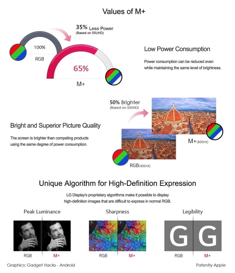 A traditional LCD panel features red, green, and blue color pixels. MLCD+, however, adds a fourth white pixel to the mix. This greatly helps in increasing the peak brightness, with the LG G7 — the first phone to launch with an MLCD+ panel — capable of reaching brightness levels of up to 1000 nits.