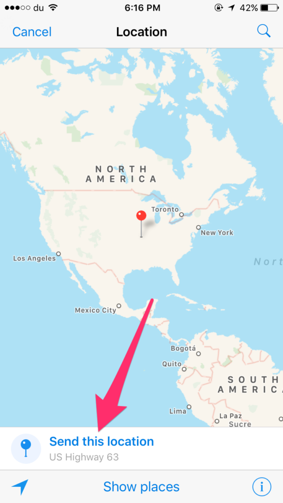 Step 5: Once your current location is detected, it will be shown on the map with a blue dot. Make sure that the pin is on the blue dot if you wish to send your current location, otherwise you can drag it to any other point on the map to send that location instead.