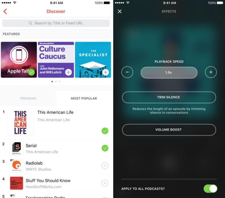 In the recent update, Pocket Casts overhauled their Discovery section and now, it’s a great way to discover new podcasts. Pocket Casts also the equivalent of Overcast’s silence removal and voice boost features.