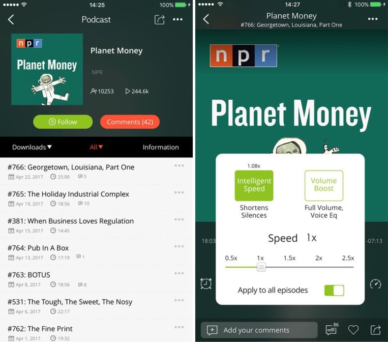 As Overcast supports an RSS feed, you’ll be able to search and add any podcast you want. For people who listen to a lot of podcasts, there’s the Smart Speed feature. It intelligently removed pauses and silent breaks in a podcast. The Voice Boost feature increases the volume of the podcast without negatively affecting the sound quality.