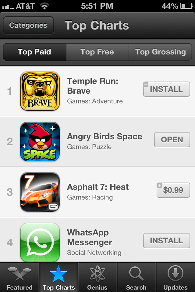 The Top Free, Top Paid and Top Grossing (and not Top Grossing Apps) tabs get the dark grey treatment in the revamped App Store app. It was light grey in iOS 6 beta 1. Thanks Jeff for the tip!