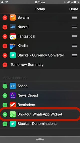 - Tap on the green add icon next to Shortcut WhatsApp Widget, and press Done.